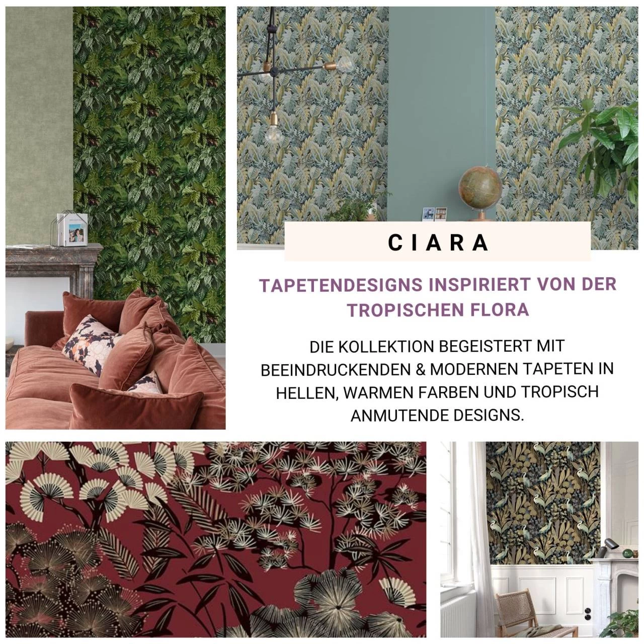 Mit den tropischen und botanischen Mustern der Tapetenkollektion Ciaras von Grandeco, haben Sie nun endlich die Möglichkeit Ihr zuhause in einem völlig neuen Glanz erstrahlen zu lassen. Die Tapeten dieser Kollektion überzeugen durch Hochwertigkeit in Kombination mit modernen Designs in hellen und warmen Farbtönen. Das sollten Sie nicht verpassen!